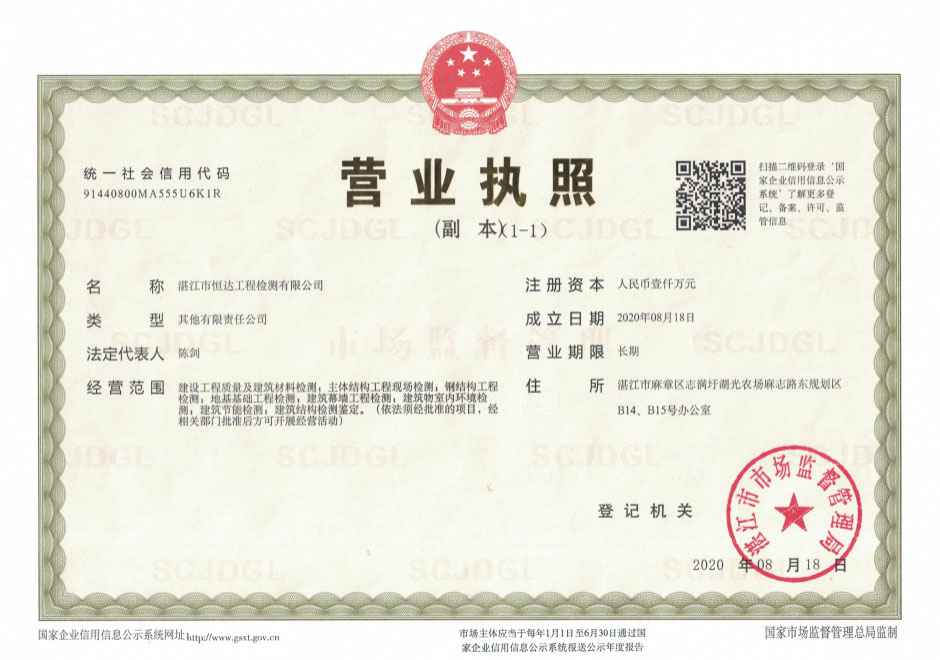 湛江市恒达工程检测有限公司取得以下资质证书: